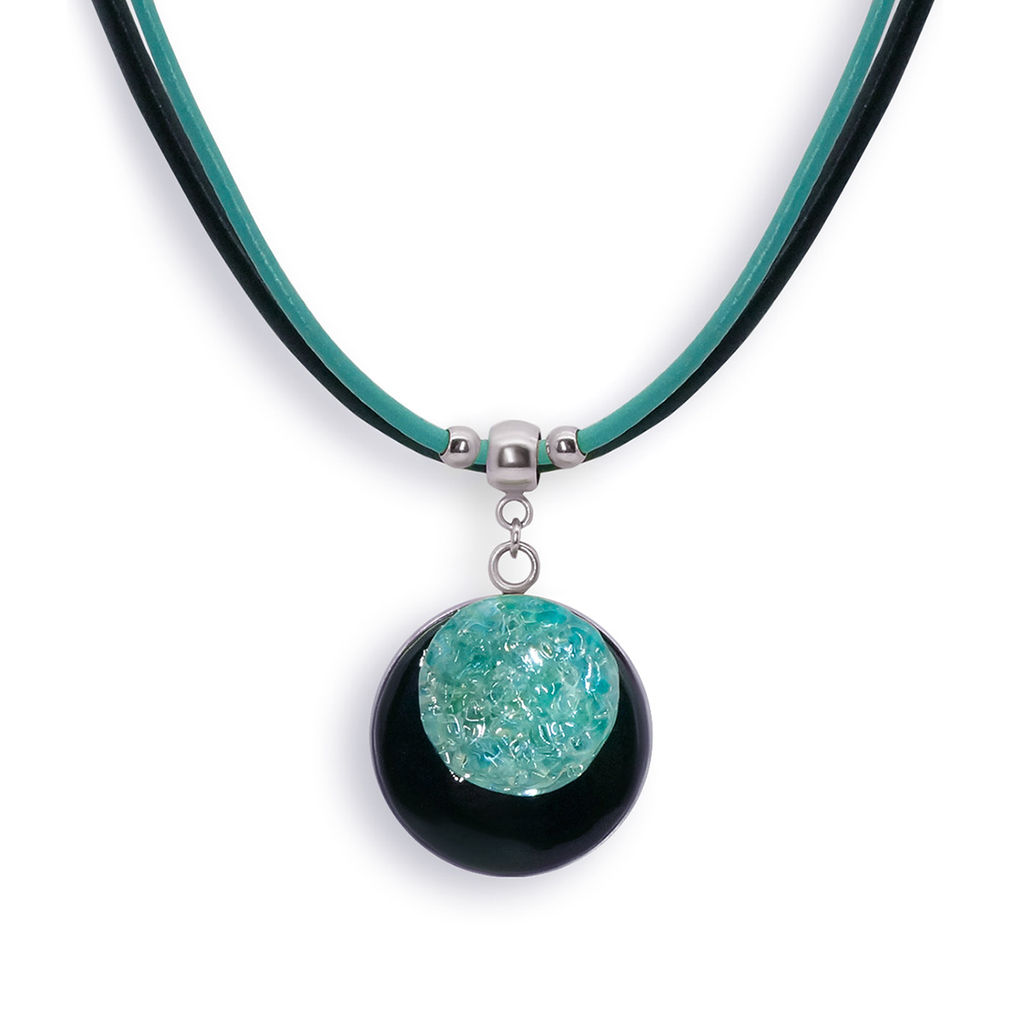 Колье изготовлено из натуральной кожи, муранского стекла и гипоаллергенной ювелирной стали, что очень важно для людей с чувствительной кожей. Металл не темнеет и не подвергается воздействиям окружающей среды, надолго обеспечивая красивый внешний вид изделия. Длина колье - 46 см + 5 см. удлиняющая цепочка. Диаметр стеклянного элемента - 2,5 см. Вес - 20 гр.­