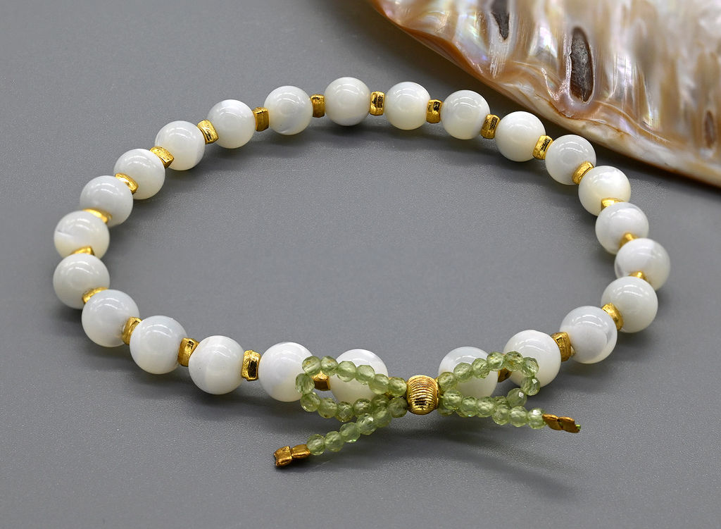 Элегантный браслет, сочетающий в себе природную красоту перламутра и энергию хризолита. Идеальное украшение для тех, кто ценит натуральные материалы и изысканный дизайн.