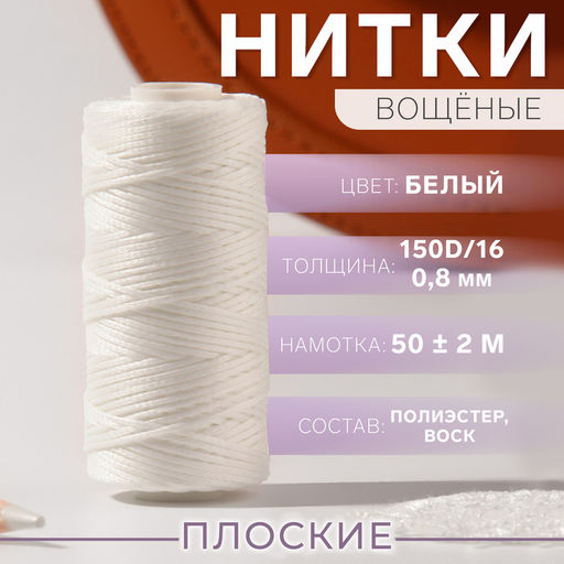 • Цена за 2 шт. Нитки вощёные, плетёные, плоские, 150D/16, 0.8 мм, 50±2 м, белые