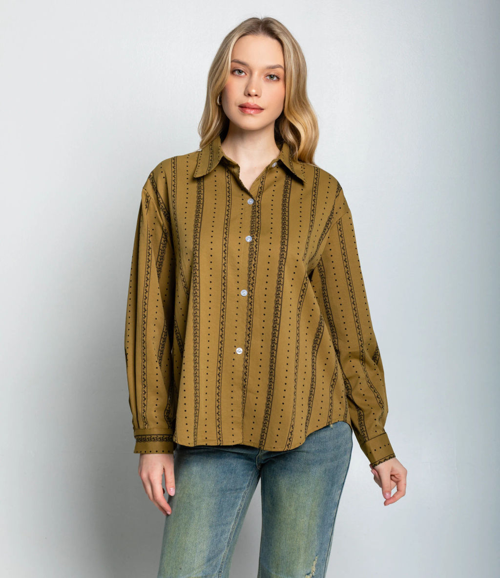 Рубашка это часть гардероба, которая подчёркивает привлекательность и индивидуальность любой женщины. Рубашка свободного кроя с классическим отложным воротником и планкой на пуговицах по всей длине; длинные рукава с манжетами на пуговицы, слегка приспущенная линия плеч; ткань средней плотности с небольшим блеском и тонкой текстурой, легкая драпировка и мягкие складки при движении; вертикальные узкие полосы, выполненные в виде чередующихся тонких рядов мелких декоративных точек и узоров, создающие удлиняющий силуэт. Для пошива использована ткань: 65% хлопок, 35% полиэстер. Мы предлагаем выгодные оптовые условия, гибкую ценовую политику и надёжные поставки для магазинов. Установленная цена адекватна и позволит вам формировать привлекательную наценку и обеспечивать высокую оборотность. Предложите своим покупательницам рубашку, сочетающую комфорт, качество и повседневную элегантность. -- Характеристики -- Цвет: оливковый Пол: Женский Страна производитель: Китай Сезон: Демисезон Материал: Хлопок, Полиэстер