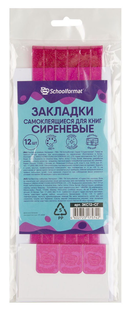 Цена за 2 шт. Закладки для книг с клеевым краем Schoolformat 12 шт сиреневые с глиттером, с европодвесом