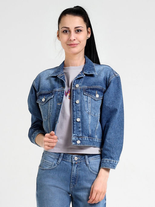 Классическая  универсальная укороченная женская джинсовая куртка. Прямой силуэт, пройма и рукава обеспечивают комфорт и не сковывают движения, по низу рукавов манжеты, застегивающиеся на пуговицу; стандартный воротник; на груди карманы с клапаном, также застегивающимся на  пуговицу; на поясе по бокам куртки хлястик и две пуговицы, которые позволяют регулировать длину обхвата по поясу. Выполнена из качественной ткани denim 100% хлопок. Средняя стирка с потертостями спереди, сзади и рукавах.