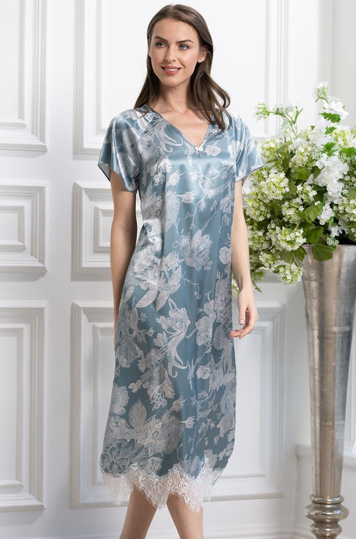 Удобное свободное домашнее платье-туника Mia-Amore со спущенными плечами, V-образной горловиной, длиной ниже колен. Туника выполнена из смесового принтованного шёлка нежного ментолового цвета.По низу туника украшена широким ажурным кружевом молочного цвета. Состав:70% натуральный шелк, 25% полиэстер, 5% эластан