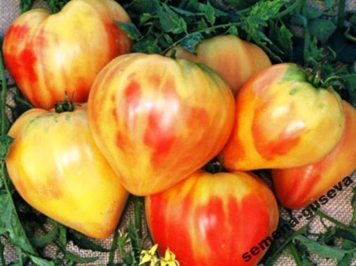 Крупноплодный, двухцветный, жёлто-оранжево-красный. Сердцевидной формы. Сахарный и мясистый на разломе. Практически без семян. Средняя масса плода 500 грамм. Высокоурожайный, прекрасного вкуса.