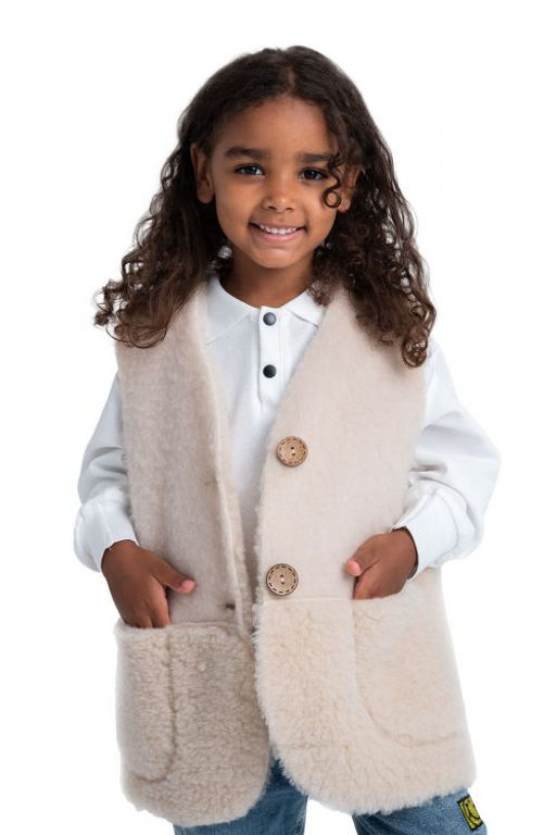 Если дома или в детском саду прохладно, очень выручит меховой жилет из тёплой овечьей шерсти. Дети терпеть не могут, когда на них надевают одежду в несколько слоев, что стесняет движения. Зато легкий жилет совершенно не будет ощущаться и мешать. При этом он надежно защитит малыша от холода и сквозняков., Выбор натуральных тканей для детей самый удачный. Воздействие   овечьей шерсти хорошего качества целебно. Оно окутывает сухим комфортным теплом. Тело не перегревается и свободно дышит., Жилет легко снимается, застегиваясь спереди на пуговицы. По бокам есть два кармана, куда малыш спрячет носовой платок и кучу других полезных вещей.