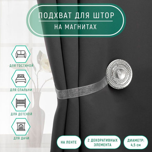 Круглые подхваты для штор это находка для хозяек, которые придерживаются классического или минималистичного стиля в дизайне квартиры. Миниатюрные, но заметные, аксессуары станут отличным дополнением не только для оконных штор, но и дверных портьер. Круглые и блестящие подхваты на ленте с удобными магнитами на концах не составит труда разместить: на высоте подоконника или чуть ниже зависит от вашего выбора. Функциональные вещички особенно понравятся практичным и педантичным хозяйкам, а их невысокая стоимость станет еще одним существенным подспорьем при их покупке. Особенности цвета: С блёстками. Форма: Круглая. Вид подхвата для штор: На ленте. Бесплатная доставка: Да. Размеры товара: 9.5/2.5/14. Примечание: Настройки вашего экрана влияют на отображение фотографии, поэтому реальный цвет товара может незначительно отличаться от фото..