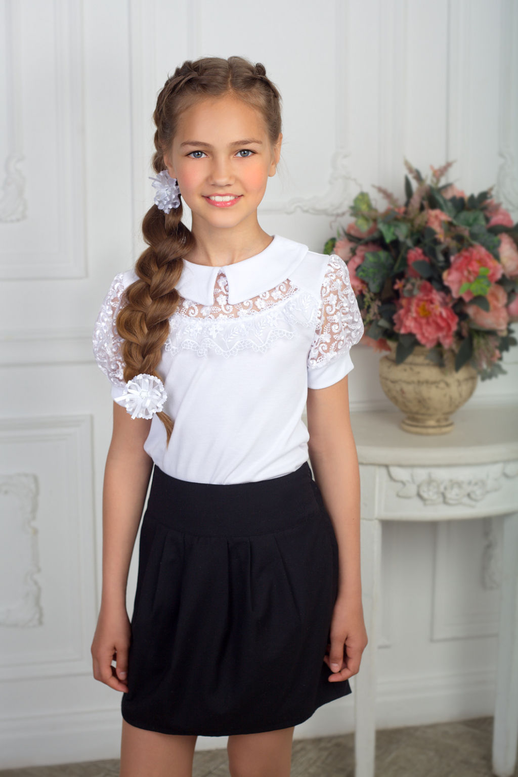 Блузка всегда актуальна.Комбинация с кружевом делают блузку нарядной.Выполнена из трикотажного полотна. Короткий рукав из гипюра. Застежка -пуговицы