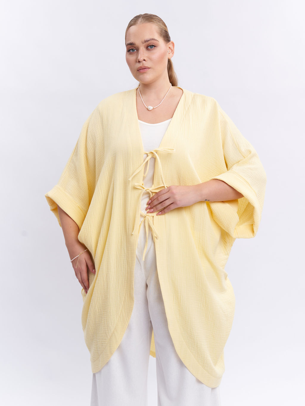 Летний муслиновый кардиган больших размеров желтый Женский кардиган пастельного солнечного оттенка из фактурной ткани. Легкая и стильная накидка не мнется и долго сохраняет свой внешний вид. Модель оверсайз овального силуэта с цельнокроеными рукавами 3/4 на широкой манжете - это идеальный выбор для жаркого времени года. Универсальная накидка станет незаменимым аксессуаром на пляже и в отпуске, гармонично дополняя ваши летние наряды. Халат на завязках идеально подходит для полных фигур плюс сайз, подчеркивая достоинства и создавая стильный образ. Тунику легко комбинировать с различной летней одеждой, добавляя изюминку в ваш летний гардероб. Размер на модели 60-62 Параметры модели: рост 178, 107/87/128 Как выбрать размер -- Характеристики -- Сезон: Лето Материал: Муслин, Текстиль Состав?01) 100% хлопок 02) 95% хлопок, 5% эластан 03) 60% вискоза, 40% хлопок 04) 60% вискоза, 40% хлопок 05) 75% хлопок, 25% полиэстер 06) 50% вискоза, 35% полиэстер, 10% шерсть, 5% эластан 07) 65% полиэстер, 25% вискоза, 10% эластан: 100% хлопок Цвет: желтый Принт: однотонный Стиль: Для полных, Пляжный, Повседневный Силуэт: Овальный Особенности: большие размеры Карманы: Без карманов Длина рукава: 3/4 Вырез горловины: V-образный Застежка: Завязки Тип рукава: Цельнокроеный Стирка: Деликатный режим, не более 30 градусов, без барабанной сушки Страна производства: Россия