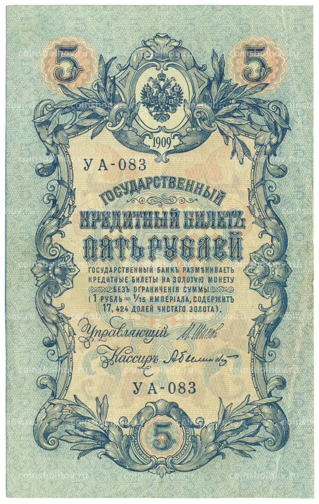 • Банкнота 5 рублей 1909 года Шипов / Былинский