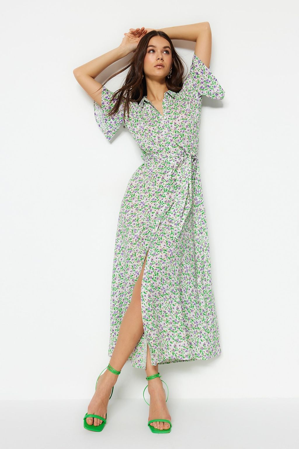 Mor Kusakl? Cicek Desenli Maxi Viskon Dokuma Gomlek Elbise TWOSS19EL0094