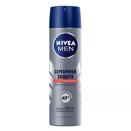 Дезодорант-антиперспирант спрей NIVEA MEN СЕРЕБРЯНАЯ ЗАЩИТА с уникальной антибактериальной формулой с ионами серебра для защиты от пота и запаха на 99,9%*. Ни один другой драгоценный металл не обладает столь сильными антибактериальными и противовоспалительными свойствами, как серебро. Кроме антибактериального эффекта, продукт успокаивает кожу и имеет свежий мужской аромат. Не содержит спирта и подходит даже для очень чувствительной кожи. Обеспечит вас надежной защитой от пота и неприятного запаха на срок до 48 часов.