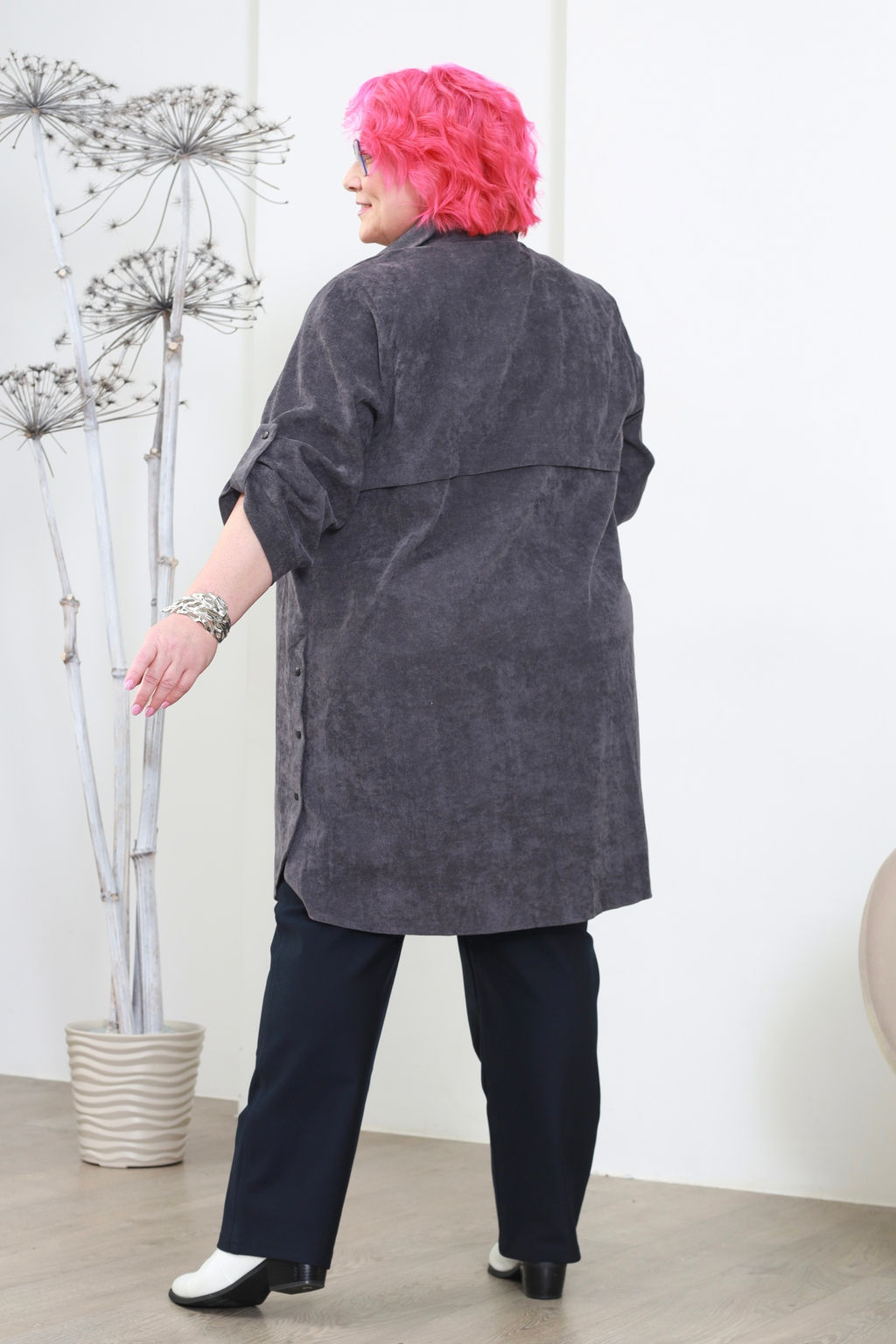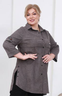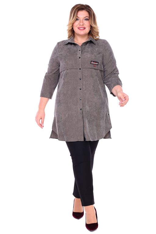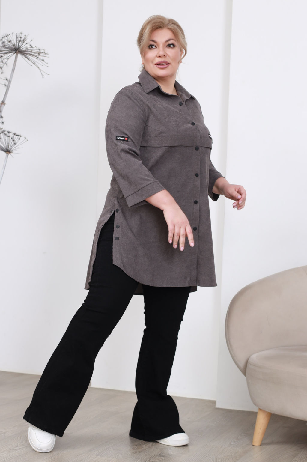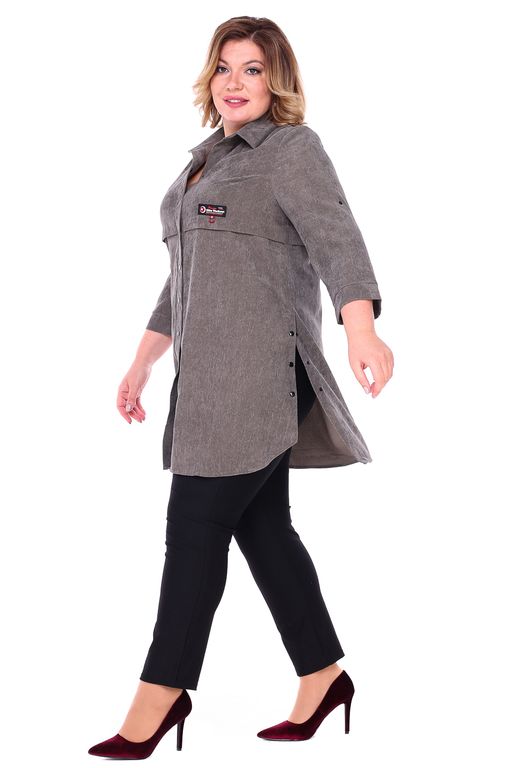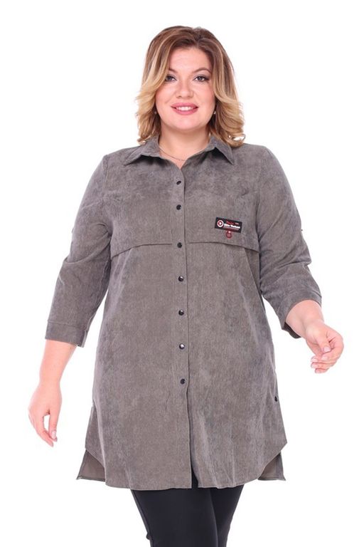 Удлиненная рубашка из мягкого материала. Материал хорошо сохраняет тепло, устойчив к деформации и практически не мнется. Модель прямого кроя имеет классический отложной воротник. Застегивается спереди на кнопки по всей длине. Рукава длиной 3/4 можно красиво присобрать патами. Декоративная планка на завышенной талии и вытачки на груди обеспечивают оптимальную посадку по фигуре. Декоративные контрастные кнопки по бокам добавляют оригинальности. Отлично подходит для комбинирования с узкими брюками и юбками и легинсами.