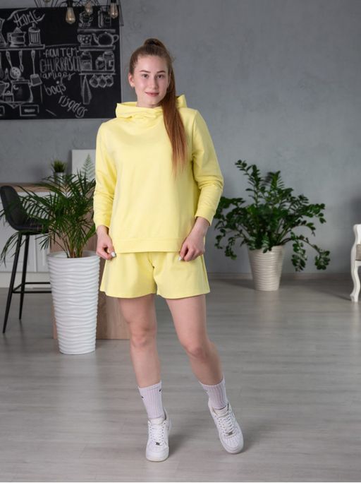 Костюм состоит из толстовки и шорт. Толстовка свободного кроя, с манжетой по низу. Рукав втачной, на манжете. Толстовка с капюшоном, капюшон двухсторонний. Толстовка свободная, удобная, комфортная, выполнена в соответствии с модными тенденциями. Шорты с притачным поясом с боковыми карманами. С поясом на резинке. Шорты свободные, длиной до середины бедра. Такой костюм станет вашим любимым, в нем вы не останетесь незамеченной.­