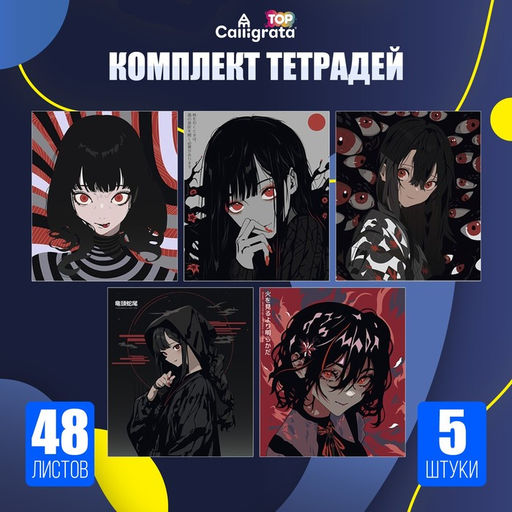 • Комплект тетрадей из 5 штук, 48 листов в клетку Calligrata "Аниме. Черное и красное", обложка мелованный картон, полный УФ-лак, блок офсет