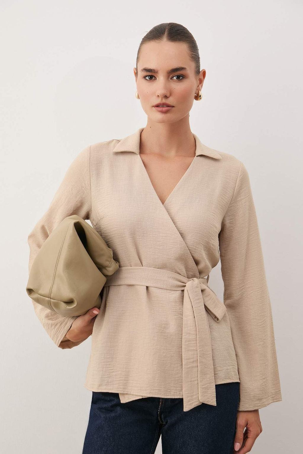 • Gri V Yaka Kruvaze Baglama Detayl? Dokuma Bluz TWOSS24BZ00371