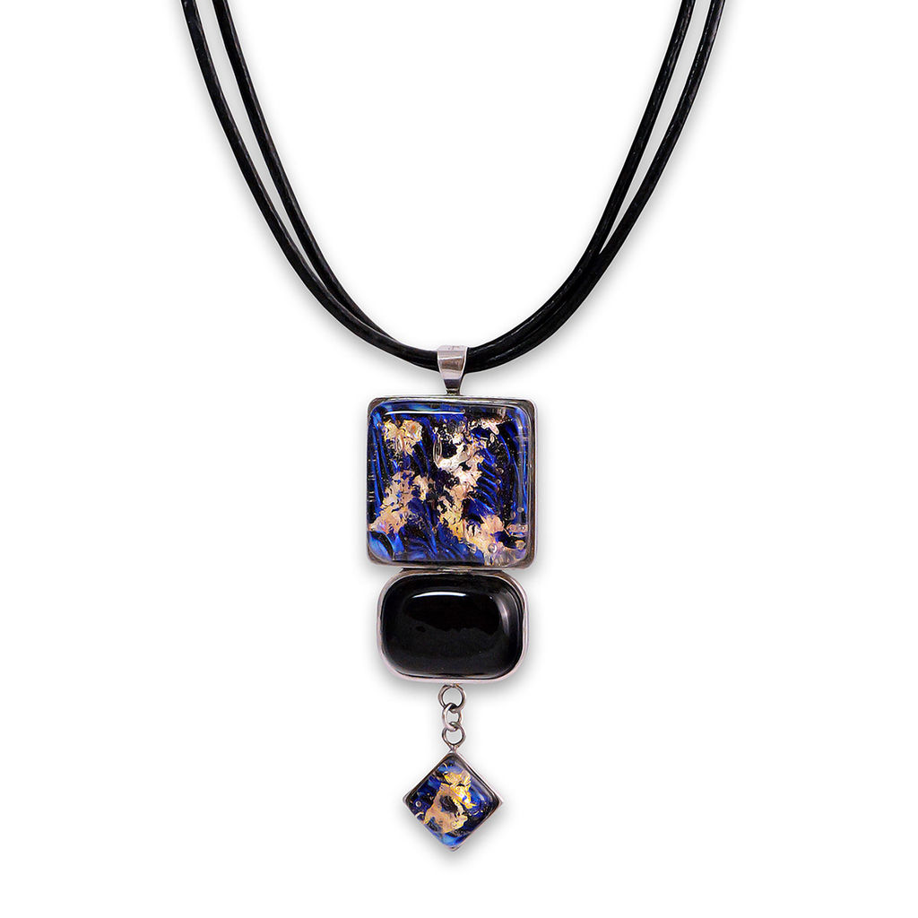 Колье изготовлено из натуральной кожи, муранского стекла и гипоаллергенной ювелирной стали, что очень важно для людей с чувствительной кожей. Металл не темнеет и не подвергается воздействиям окружающей среды, надолго обеспечивая красивый внешний вид изделия. Длина колье - 46 см + 5 см. удлиняющая цепочка. Длина кулона - 6 см. Размер стеклянных элементов - 2,2х2,2, 2х1,5 и 1 см. Вес - 28 гр.­
