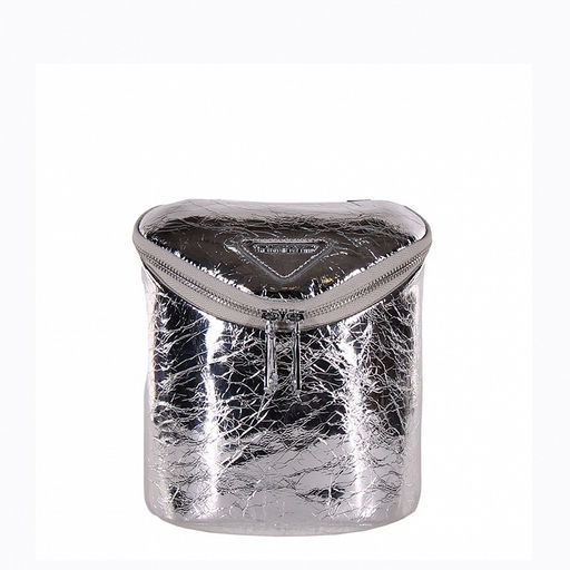 Эффектная металлизированная сумка интересной формы, выполнена из натуральной кожи. Декорирована логотипом бренда на передней части. Дополнена серебристой фурнитурой. Данная модель закрывается на молнию. Каркас полужесткий. Носится через плечо. В комплекте есть ремень-стропа и ключница.