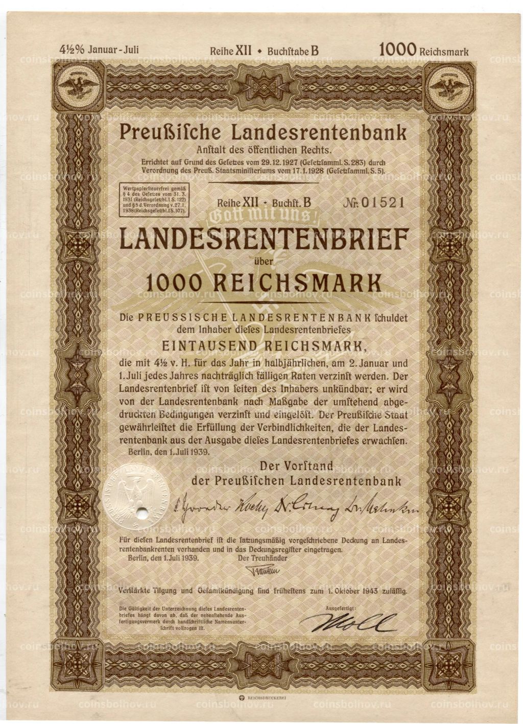 • Облигация 4,5% 1000 рейхсмарок 1939 года Германия