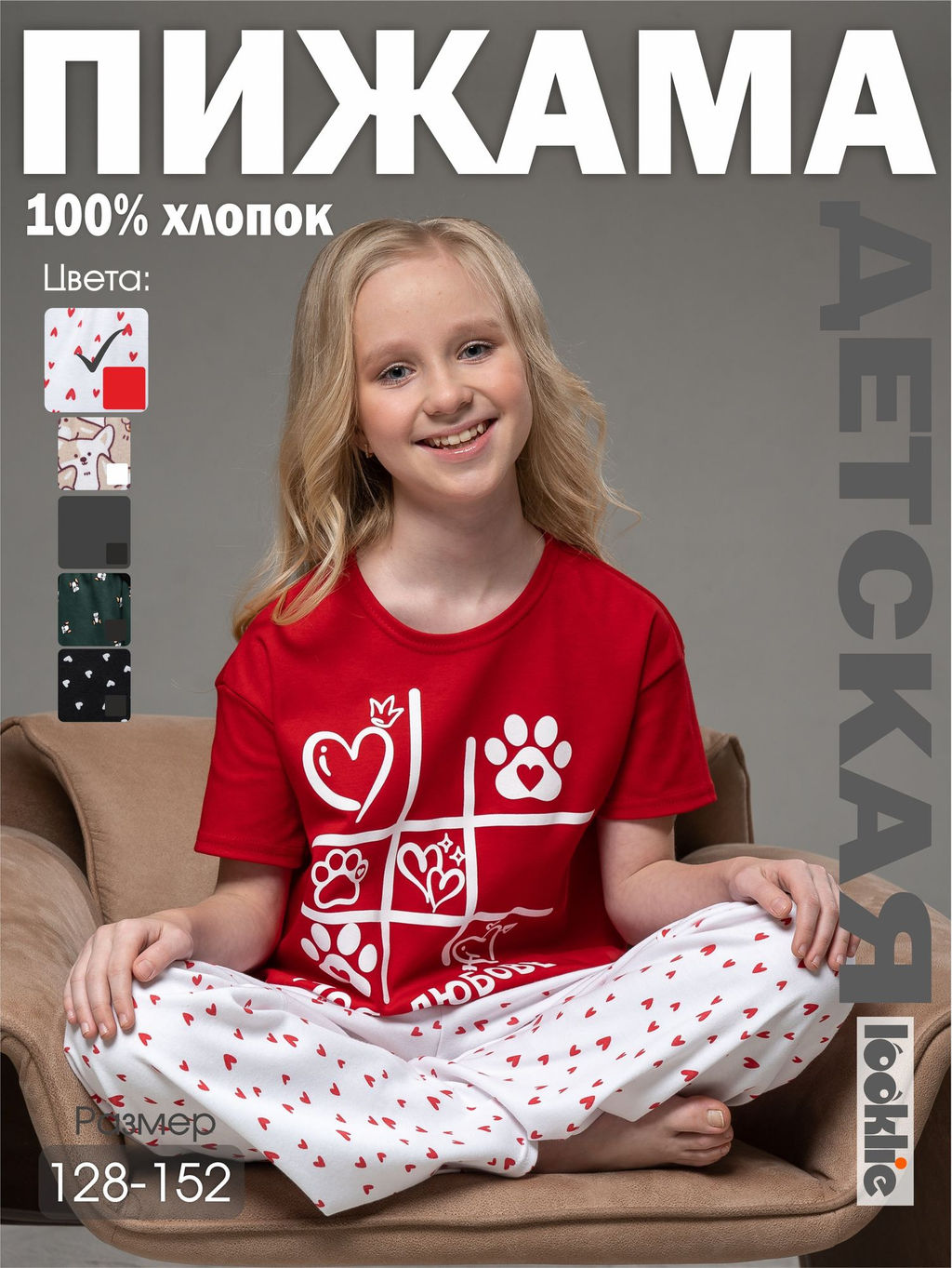 Пижама из интерлока красного цвета для девочки свободного силуэта . Состоит из футболки и брюк . Футболка с расширенной линией плеча, округлой горловиной и длинными рукавами. Прямые брюки с цельнокроенным поясом на резинке без бокового шва.