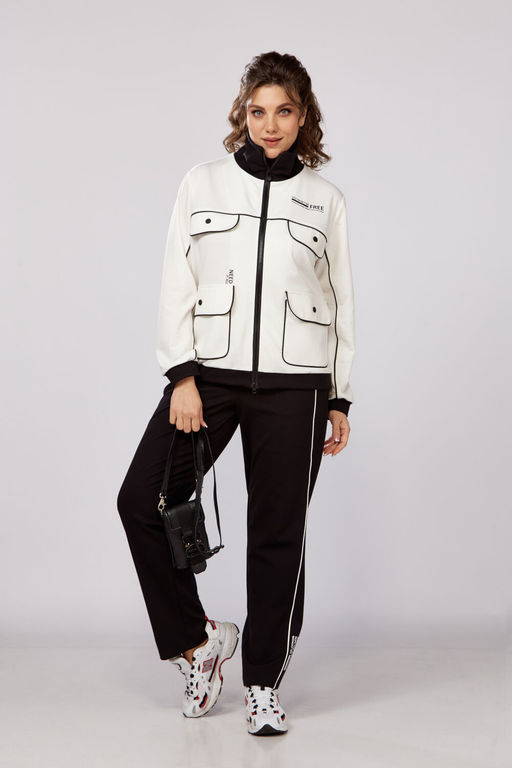 Стильный, удобный, трикотажный, спортивный костюм для активной повседневной жизни, в котором сочетаются модный дизайн и комфорт. Бомбер свободного силуэта на молнии, воротник отложная стойка.  Накладные карманы, клапаны, кокетка и рукава декорированы отделаны контрастным черным кантом, в цвет брюк. Брюки на резинке с боковыми карманами и подрезами с декоративным кантом. Костюм отлично садится и скрывает недостатки фигуры из-за хорошо продуманных конструктивных линий и пропорций.
