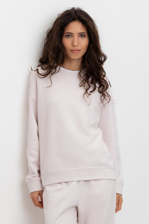 Объемный свитшот из двухцветного трикотажного футера. Внутренняя сторона изделия представлена в натуральном цвете хлопка, внешняя в нежно-розовом. За счет использования крашенной пряжи, данный вид полотна прошел минимальную обработку, что придало изделию мягкость и шелковистость.. Состав: 80% хлопок, 20% полиэстер