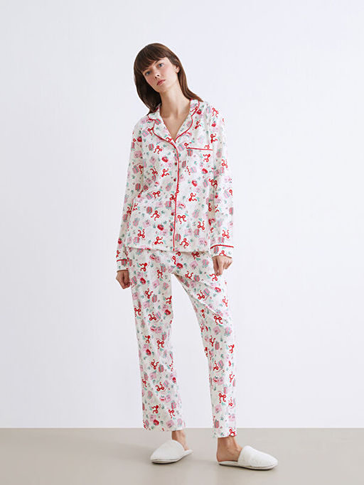 G?mlek Yaka Y?lba?? Temal? Kad?n Pijama Tak?m?