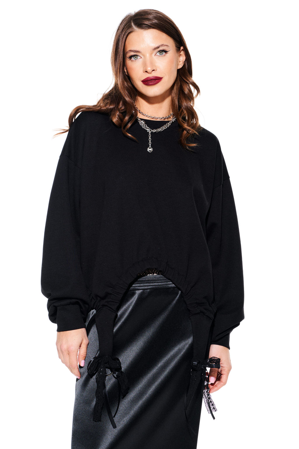 Свитшот из трикотажного полотна, свободного объема, прямого силуэта, с круглым вырезом горловины. Перед с фигурной линией низа со сборкой на резинку, декоративными полукольцами и тесьмой из кружева и атласа. Спинка со сборкой на резинку по низу изделия. Рукав втачной, длинный. По низу рукава притачные манжеты. Состав: 80% хлопок, 20% ПЭ