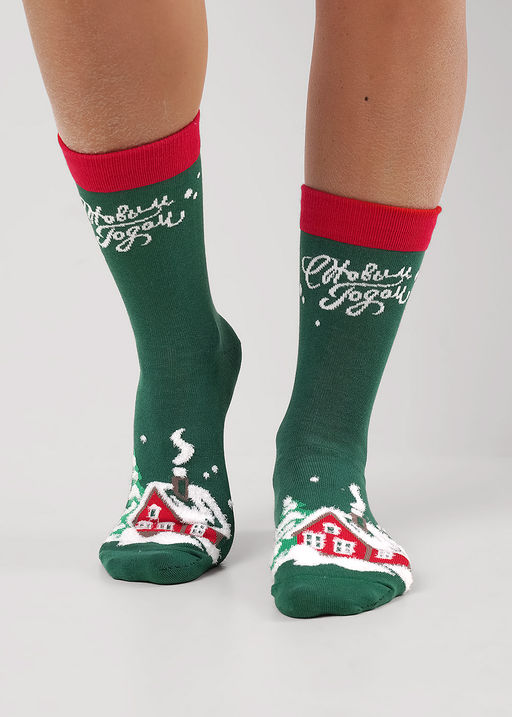 Носки мужские с рисунком дом в зимнем лесу, снег выполнен из пряжи травка, и надписью С Новым годом! 70% хлопок, 25% полиамид, 5% эластан