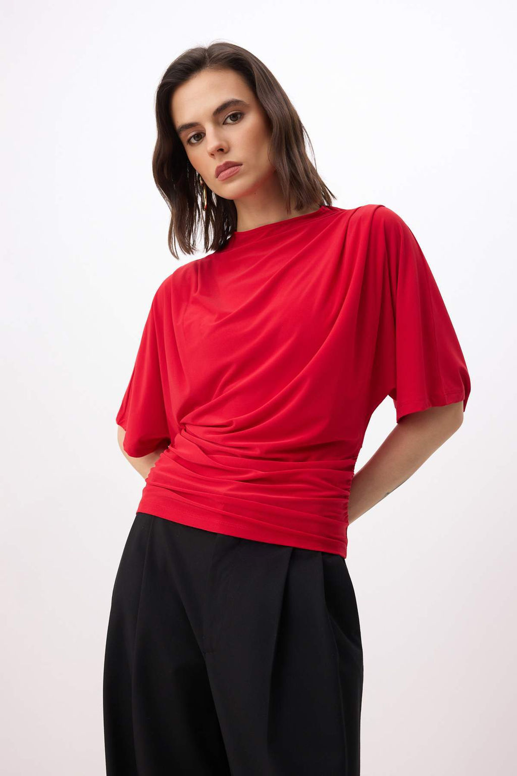 • K?rm?z? Fitted/Vucuda Oturan Kay?k Yaka Yarasa Kol K?sa Kollu Esnek Orme Bluz TWOSS26BZ00020