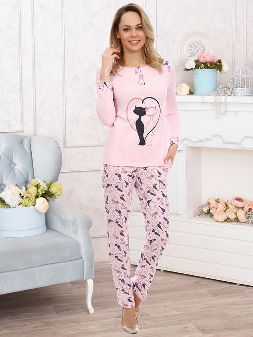 Пижама женская. Футболка с длинным втачным рукавом на манжете, на детали переда не большая кокетка, по центру переда печать. Брюки прямые на притачном поясе с резинкой. В боковом шве карман.