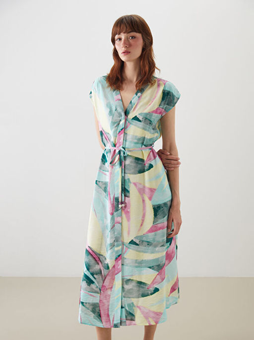 V Yaka ?i?ekli Ku?akl? G?mlek Elbise