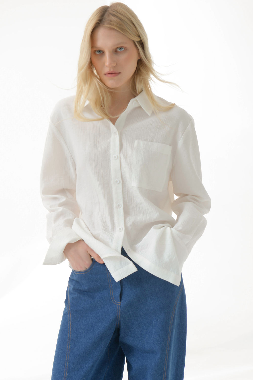 Рубашка с воротником-стойкой .Создана из мягкой, дышащей жатой хлопковой ткани.Аккуратный ,свободный силуэт. Воротник-стойку можно зафиксировать пуговицей или оставить классический воротник. Рубашку легко стилизовать и для вечеринки, и для будней в офисе. Длина изделия от плеча 72 см.