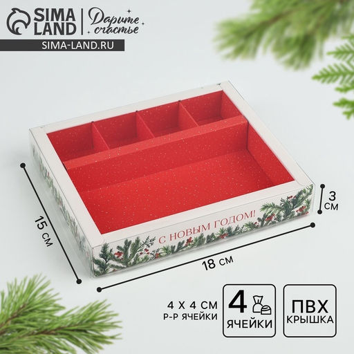 • Цена за 5 шт. Коробка под 4 конфеты и шоколад новогодняя с ячейками «Еловый аромат» 18×15×3 см