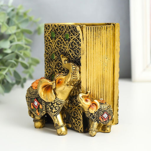 • Фигурка-карандашница полистоун Слон и слонёнок в попоне с цветком, под бронзу, 8.5?9?11.5 см
