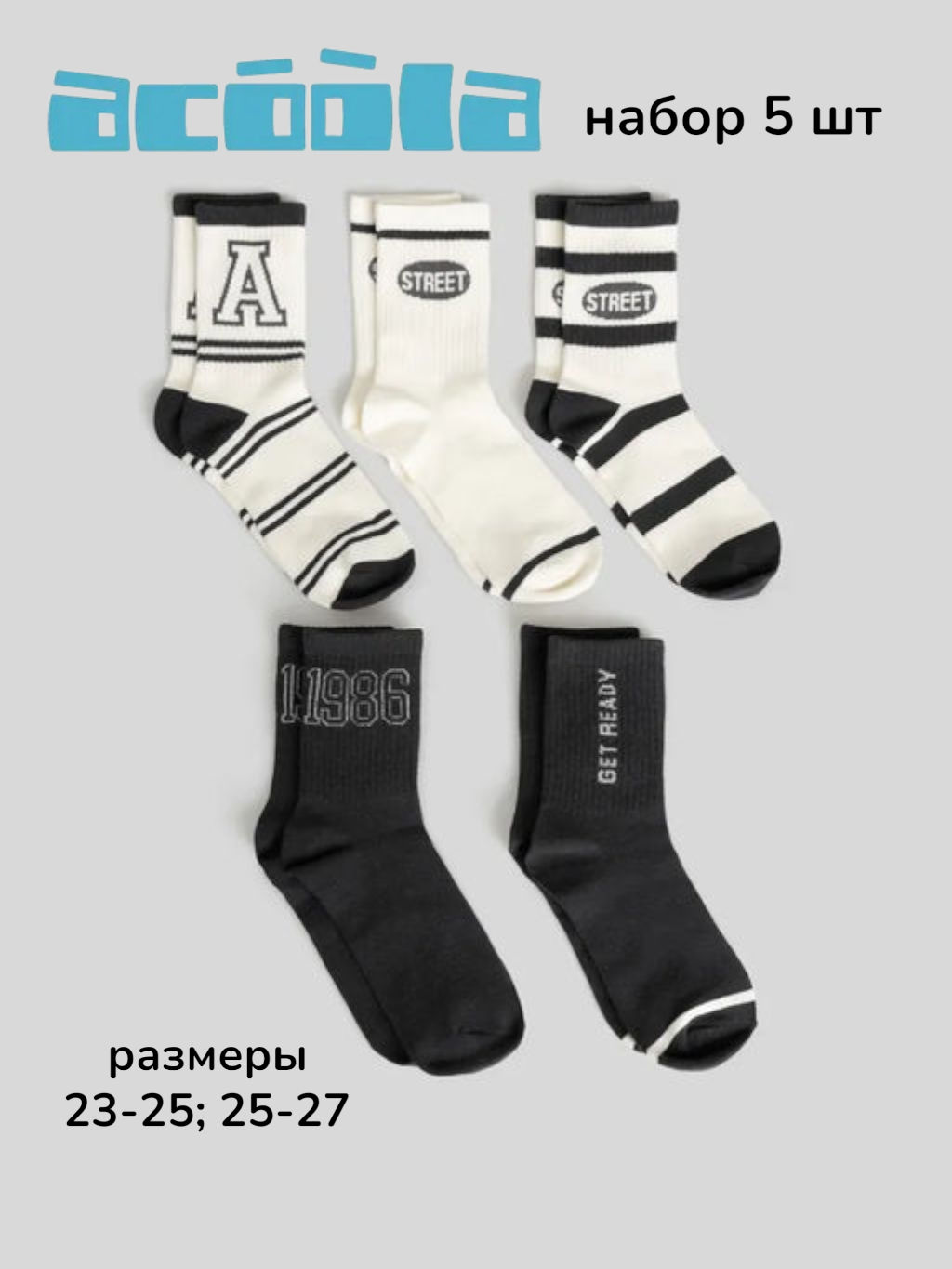 Набор из 5-ти пар детских носков для мальчиков выполнен из мягкой и дышащей хлопковой пряжи, которая обеспечивает комфортное ношение на протяжении всего дня. Высокие детские носки со спортивной резинкой надежно и удобно садятся по ноге и не сползают даже во время активных игр или занятий спортом. В сет входят три пары белого цвета, украшенные контрастными полосками и надписью "STREET" англ. - "Улица" и две пары черного цвета с надписью "GET READY" англ. - "Будь готов". Стильные спортивные носки для мальчика завершат модные образы в повседневном или спортивном стиле и добавят к ним стильный штрих. 20104420015