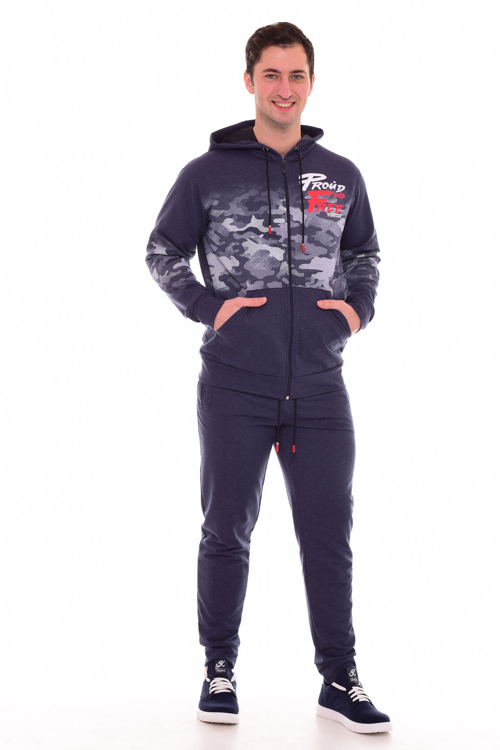 Костюм мужской состоит из толстовки на молнии с капюшоном, карманом кигуруми, по рукавам и полочкам принт камуфляж. Брюки-джоггеры, зауженные к низу на манжете, двумя боковыми карманами на молнии. Пояс на резинке со шнуром. На задней правой половине брюк накладной карман с принтом. Длина толстовки: 46-68 см, 48-69 см, 50-70 см, 52-71 см, 54-73 см, 56-74 см, 58-75 см, 60-76 см. Длина рукава-46-62 см, 48-63 см, 50-63 см, 52-63 см, 54-63 см, 56-63 см, 58-63 см, 60-63 см. Длина брюк по шаговому шву: 46-100 см, 48-100 см, 50-100 см, 52-102 см, 54-102 см, 56-102 см, 58-103 см, 60-103 см. Длина брюк по шаговому шву: 46-77 см, 48-77 см, 50-76 см, 52-76 см, 54-75 см, 56-75 см, 56-75 см, 58-74 см, 60-74 см.