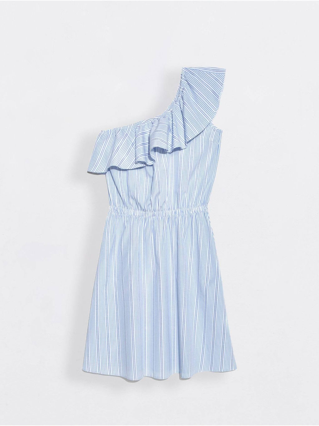 Ультрамодное платье на одно плечо с воланом из фактурной ткани в вертикальную полоску must have в летнем гардеробе современной девушки.
