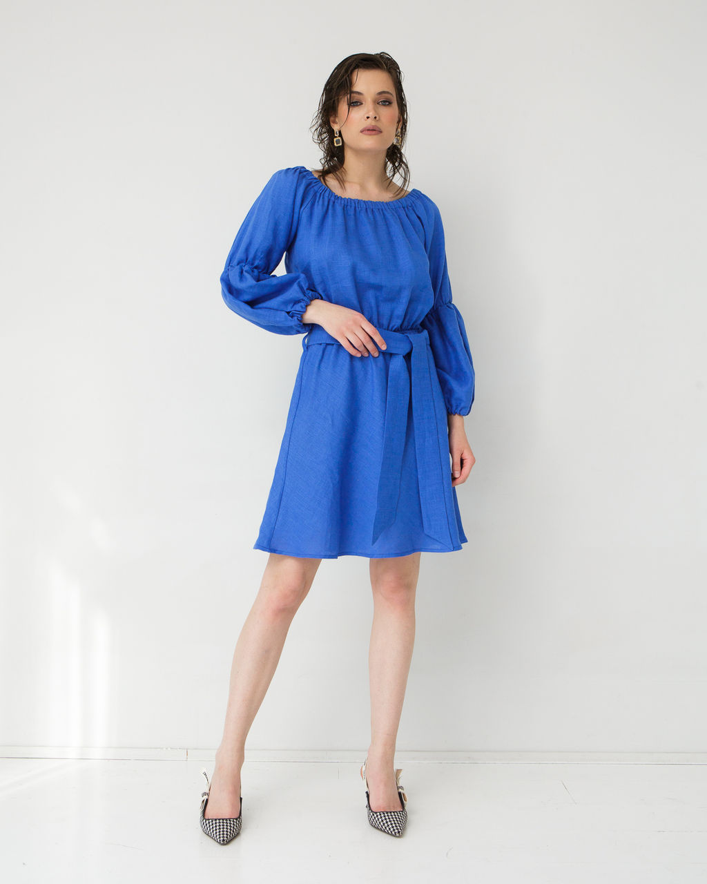 Свободный силуэт с эластичной линией декольте создает женственный и расслабленный образ, а объемные рукава на резинках добавляют нотку романтичности и изысканности. Пояс, входящий в комплект, позволяет подчеркнуть талию и создать более структурированный силуэт по желанию.