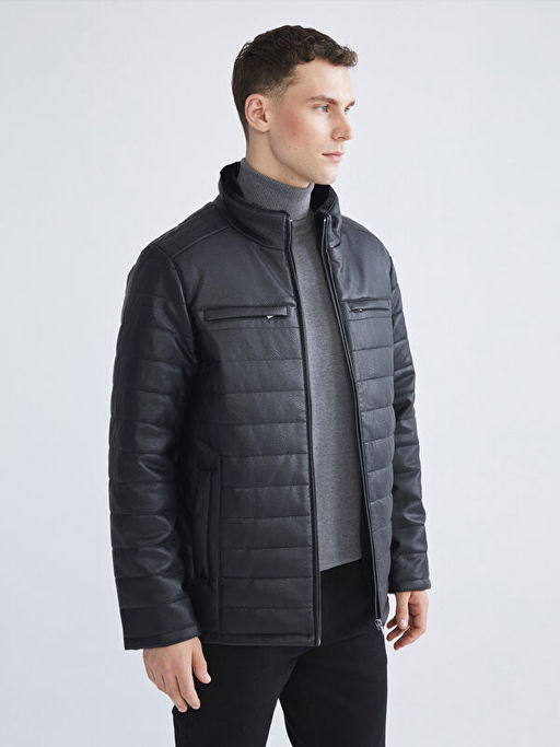 Standart Kal?p Dik Yaka Erkek Deri G?r?n?ml? Mont