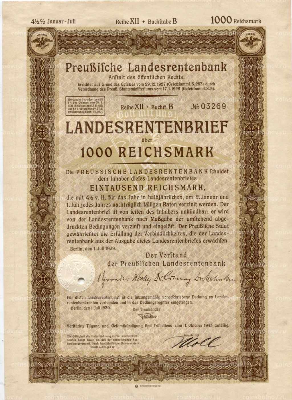 • Облигация 4,5% 1000 рейхсмарок 1939 года Германия
