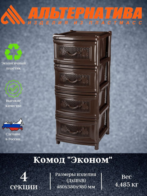 С помощью практичного пластикового комода вы правильно организуете хранение вещей. Изделие имеет жёсткую конструкцию за счёт цельных боковых стенок. Отсутствие острых углов делает его безопасным для ребёнка. Комод изготовлен из экологически чистого материала, не содержит вредных веществ.