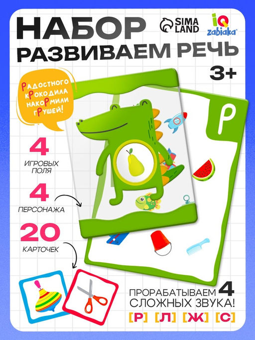 Внутри набора ребёнок найдёт двусторонние основы для выполнения заданий.Выберите звук, который малыш будет тренироваться произносить. И положите соответствующую карточку перед ним.К каждой карточке-основе прилагаются 10 карточек с предметами 1 карточка с персонажем. Они совпадают цветом рамки с основной карточкой.Игра рекомендована всем любознательным малышам старше 3 лет. Возраст: От 3 лет. Развитие навыков: Чтение. Развитие навыков: Постановка речи. Развитие навыков: Память. Развитие навыков: Логика. Развитие навыков: Внимание. Развитие навыков: Моторика. Развитие навыков: Буквы, цифры. Бесплатная доставка: Да. Наша разработка: Да. Размеры товара: 17.2/1.5/12.2.