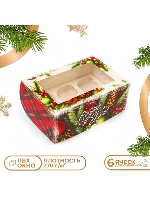 • Цена за 5 шт. Коробка для 6 капкейков с окном «С Новым годом», 25×17×10 см