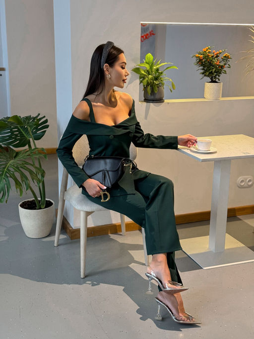 Брюки прямого силуэта. Застёжка -гульфик с молнией. Обработаны карманы в боковых швах. Передние половинки по центру  брюк обработаны отделочным швом с разрезом по низу­