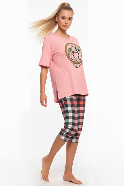 Представляем вам женскую пижаму с бриджами – идеальный домашний костюм для уютных вечеров и расслабляющего отдыха. Эта модель создана из высококачественного хлопка, что обеспечивает максимальный комфорт и приятные ощущения при ношении. Пижама отлично подходит для дома, позволяя чувствовать себя свободно и непринужденно.