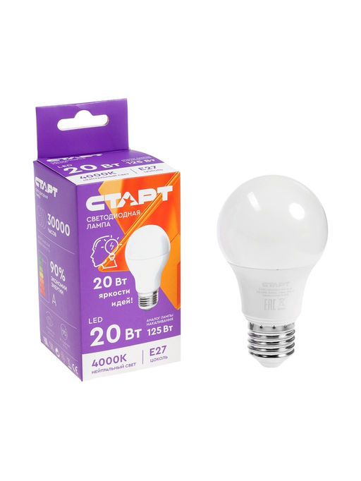 • Цена за 2 шт. Лампа светодиодная СТАРТ, 20 Вт, Е27, 4000К, 1600 Лм, холодный (нейтральный) свет