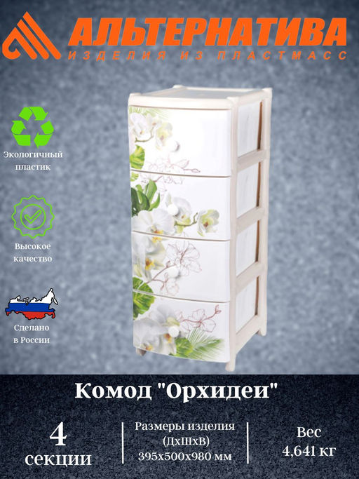 Изделие способно гармонично вписаться в интерьер любой комнаты. Комод произведен из высококачественного и безопасного полипропилена. При производстве используется только сертифицированное и экологически чистое, качественное сырье отечественных и зарубежных производителей. Данное изделие произведено на современном технологичном оборудовании, а потому отличается прочностью и устойчивостью разнообразным механическим воздействиям. Также особую прочность изделию придает цельная конструкция перегородок. Комод имеет четыре выдвижных ящика, большой вместимости, в которых будет очень удобно хранить личные вещи и другие принадлежности.