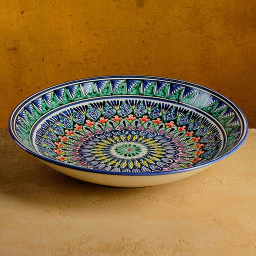 Посуда с национальной росписью станет отменным подарком для ценителей высокородной посуды.Риштан — город на востоке Узбекистана, один из древнейших в Ферганской долине. С давних времён Риштан славится своим гончарным искусством изготовления цветной керамики. Красноватую глину для изделия добывают в самом городе. Мастера утверждают, что их глина настолько высокого качества, что даже не нуждается в предварительной обработке. Дополните коллекцию кухонных аксессуаров пряными восточными нотами.Все товары производства Узбекистан. Набор: Нет. Форма: Круглая. Диаметр, см: 33. Тематика: Цветочно-растительная. Тематика: Растительный орнамент. Рисунок: Да. Крышка: Нет. Можно мыть в посудомоечной машине: Нет. Можно использовать в СВЧ-печи: Да. Особенности: Глазурованные. Бесплатная доставка: Да. Примечание: Ручная работа, рисунок может отличаться от фото. Примечание: Изделие нельзя мыть в посудомоечной машине.