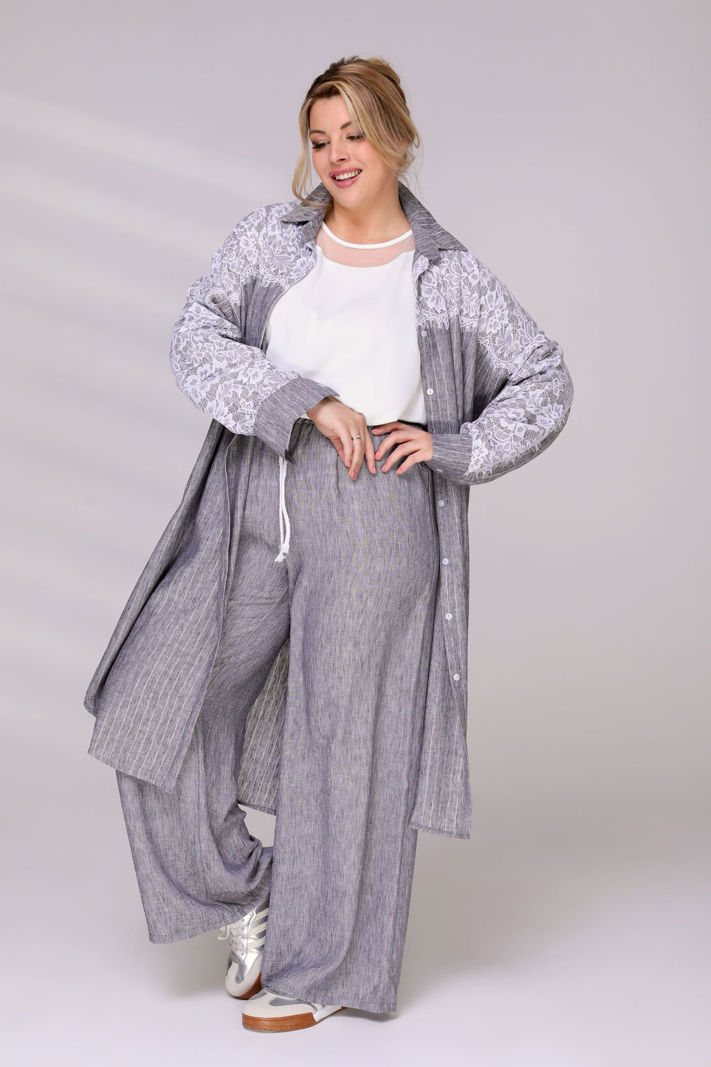 Костюм брючный с удлиненным верхом с гипюровой вставкой серый­