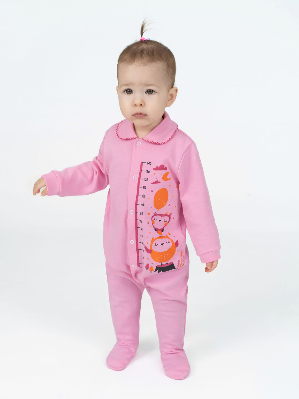 Детский комбинезон-слип для девочки. Мягкий хлопковый трикотаж. Закрытые ножки, длинные рукава. Отложной воротник, манжеты. Застежка на кнопках. Розовый цвет с принтом " совята на пенёчке " .